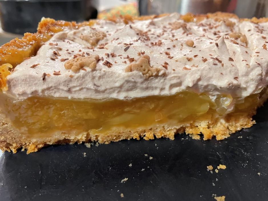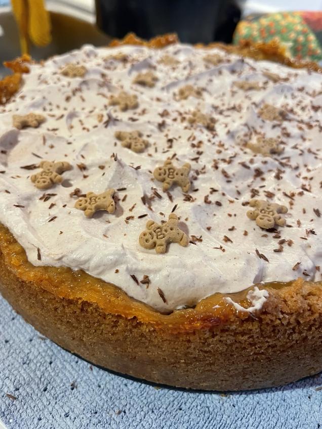 Komplett, am besten über Nacht, auskühlen lassen, die Füllung setzt sich dabei. Vor dem Servieren Sahne mit Vanillezucker und Zimt steif schlagen, auf die Füllung geben, mit Lebkuchenmännchen und Schokolade verzieren.