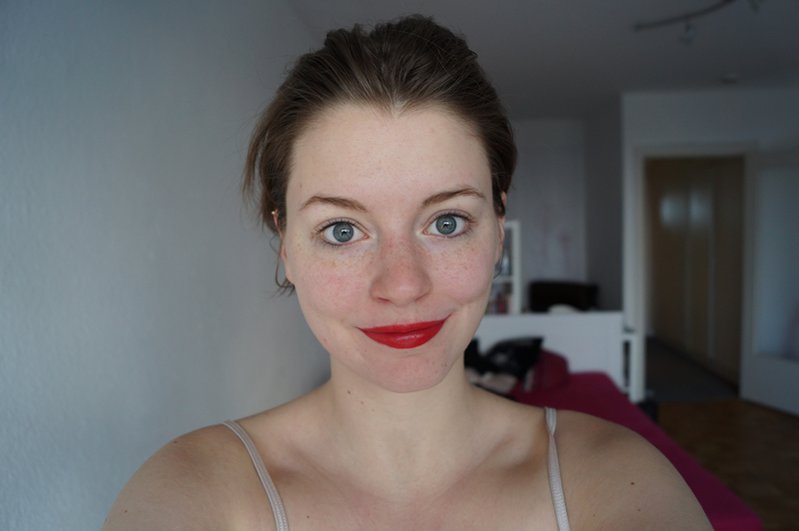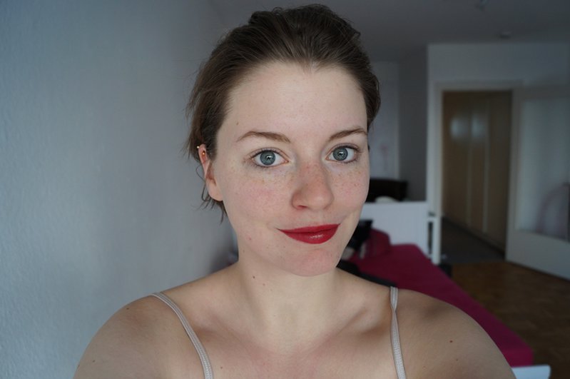 Wenn ich den Lippenstift trage, hab ich meistens nur beigen und braunen Lidschatten drauf, da er recht knallig ist und ich es nicht mag, so krass "geschminkt" auszusehen.