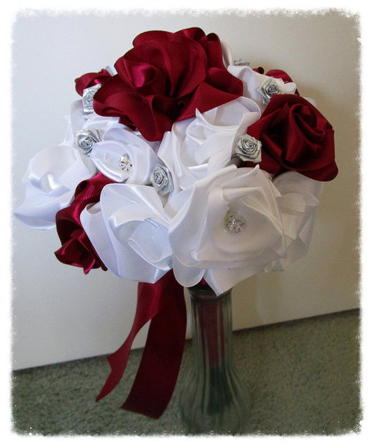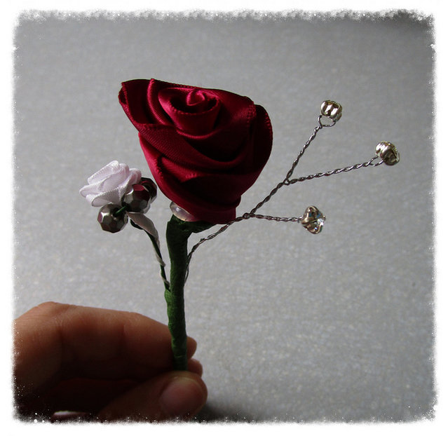 Hier noch eine Seitenansicht vom Brautstrauss und eine der Blumen zum Anstecken fuer die Familienmitglieder.