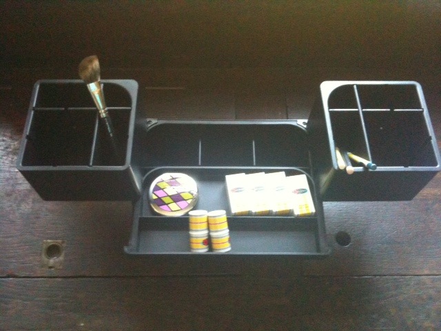 Fuer Naynay zum Groessenvergleich. Wie du siehst, passt echt nicht viel rein. Stifte nur, wenn sie schon 1/3 weggespitzt sind. Paletten gar nicht, ausser man nimmt die Innenunterteilung raus. In die obere Reihe passen drei Compacts und ein Blush, darunter dann ca. sieben e/s.