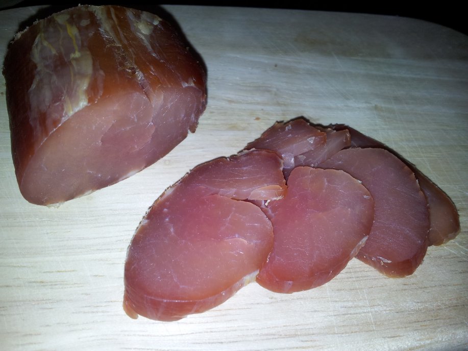 Die Lenden habe ich 2 Wochem im Vakuum gepökelt (mit Meersalz, Kiwi, Knoblauch, Honig und versch. Gewürzen) und dann 2 Tage im Kühlschrank antrocknen lassen. Zweimal mit Walnussgeist angesprüht.