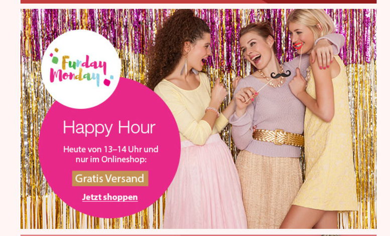Die Homepage spricht von einer anderen Happy Hour als der Newsletter... Das verstehe, wer will. Allerdings sind die einzelnen Produkte (noch) nicht mit dem "Versand gratis" gekennzeichnet, was ja sonst üblich ist.