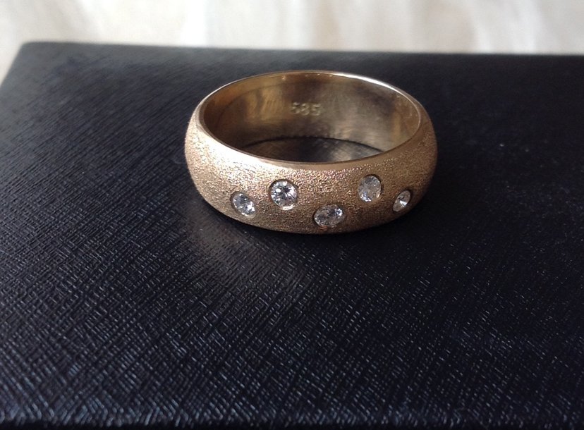 : 5 kleine Steinchen, selbes ct- Gewicht in 375er GG knapp unter 240 €. Beide Ringe aus Schlußverkäufen. Und Du hast fünf nicht gerade kleine Steine. Und konntest Dir Dein Design nach Wunsch anfertigen lassen.