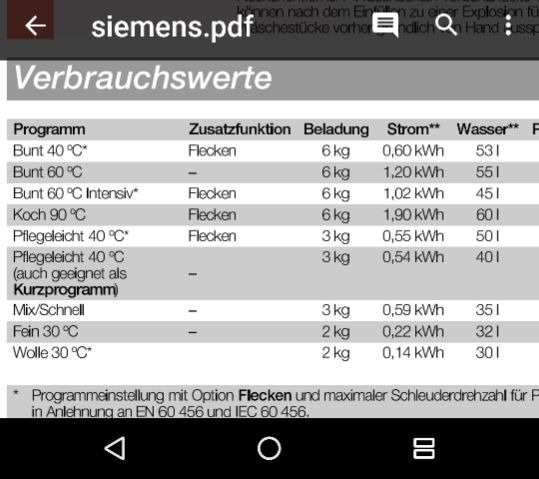 Ich habe mal eine Frage zum Thema Verbrauchswerte. Bei meiner Siemens sehen die so aus. Was mir aufgefallen ist, mit Fleckenprogramm wird weniger Strom verbraucht, weil längere Waschdauer. Ist das bei Euch auch so?