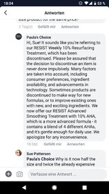 aber wenn das weekly bei allen so lange hält wie bei mir (jetzt schon über drei Jahre), die anderen wegen der Milde sich schneller verbrauchen, dann ist es blöderweise schlau von PC, das weekly aus dem Sortiment zu nehmen und darauf zu hoffen, dass die Kunden das andere 10% oder die Resist BL kaufen und das entsprechend öfter ordern. Ich danke Dir auf jeden Fall für den Hinweis - ich ziehe jetzt in Erwägung, zur GSW gleich zwei Exemplare zu kaufen - ich habe ja so ein Bunker-Gen für Sachen, die ich gut vertrage, wenn die aus dem Sortiment gehen dann kaufe sicherheitshalber nochmal nach, wer weiß, was kommt... bei der Clinique MCL und der babylove leichten Gesichtscreme hat sich das bewährt, die wurden vor einigen Jahren zu meinen Ungunsten umformuliert und ich habe bisher für keine von beiden einen gleichwertigen Ersatz gefunden...