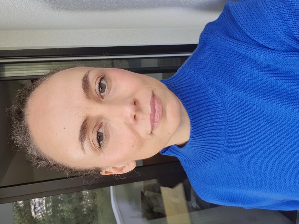 Farben reflektieren ja das Licht auf unsere Haut. Je nachdem, ist dieses reflektierte Licht besonders günstig für den Teint oder eben nicht. An dem Blau kann man wunderbar sehen, wie es Frische und Klarheit ins Gesicht reflektiert und dadurch den Teint schön frisch und strahlend aussehen lässt. Schau mal wie hell die Augenschatten unter den Augen dadurch werden. Man sieht sie auf dem Bild viel weniger im Vergleich zu diesem burned orange Pulli z.B.