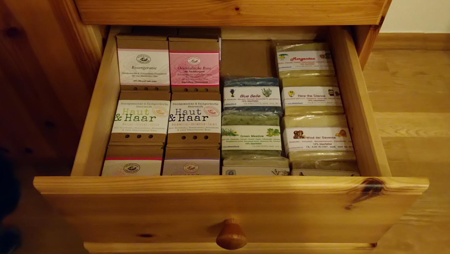 Die kleinen Schübe mit den befufteten Seifen sind im Wohnzimmer, der Schub mit den unbedufteten im Schlafzimmer