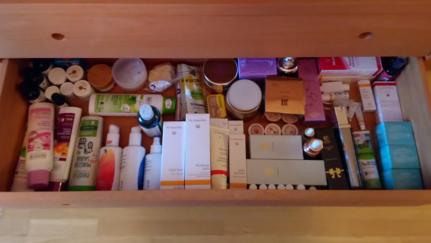 Ich habe heute meinen Kosmetikschub auch mal fotografiert, mir ist das schon viel zu vielAber da es für ein Jahr reichen soll, hatte ich Ende des Jahres noch aufgestockt, dadurch ist es so viel geworden.