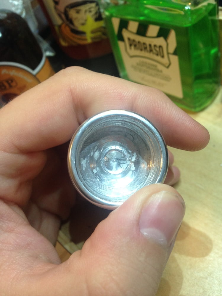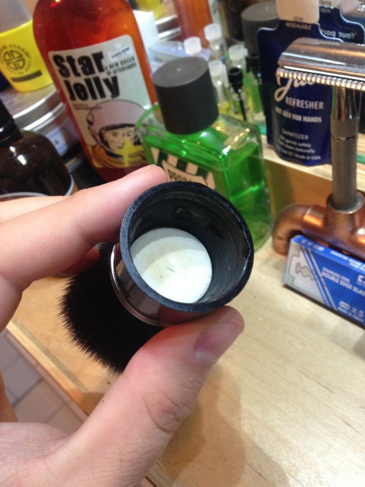 Das die Rasierseife nicht richtig an der glatten Schale bappen blieb, lag zugegebenermaßen daran, dass ich sie nie einweichen ließ.