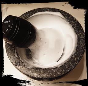 Den Mörser den ich jetzt wieder habe ist leider doof, da riecht die Seife und der Pinsel immer nach Steinstaub, und das finde ich extrem doof.