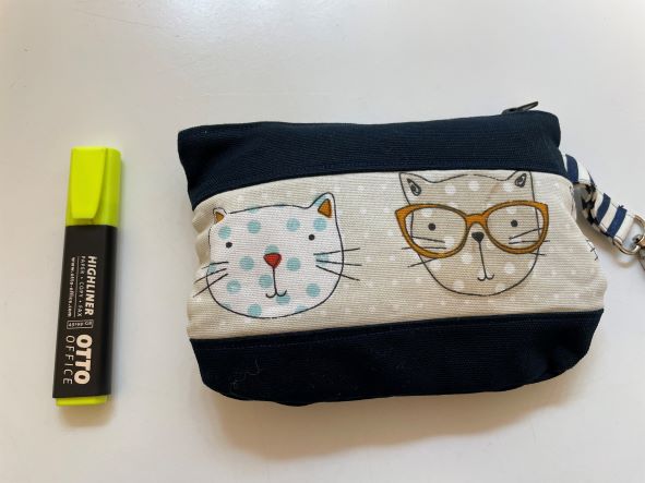 Bitte sehr - mit Größenvergleich Passt ideal in meine Arbeitstasche. Da drin habe ich eine Maske, Aspirin, Händedesinfektion, Minzpastillen (auch mit Katzenmotiv ), eine kleine Tube Handcreme....
