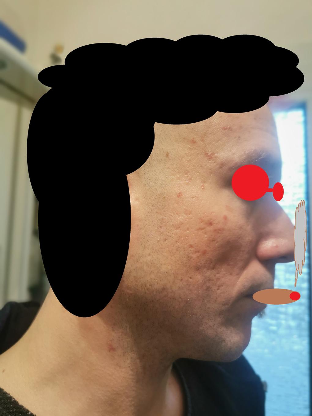 Also knapp beim Wangenknochen (das da drunter ist glücklicherweise nur ein Grübchen ) ist eine ganz leichte Narbenfläche aus der schlimmeren Zeit in meiner Jugend aber die finde ich nicht mal ganz sooo schlimm.