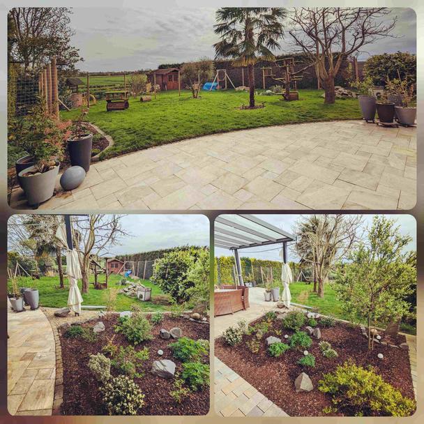 Heute waren wir fleißig, Terrasse ist gekärchert und im Beet die ersten Pflanzen drin, noch nicht fertig ...