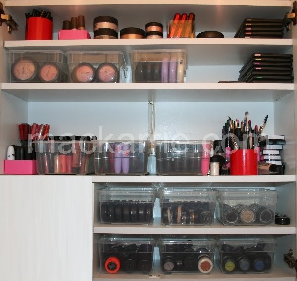 ich hab ähnlichen Schrank und ähnliches Problem (wenig Platz). Ich hab gern diese Kosmetiktäschchen (wie auf Foto), damit kann man auch bißchen sortieren und Ordnung halten und wenn man was für unterwegs braucht, kann man sich schnell so ein Täschchen zusammen packen und hat alles beieinander.