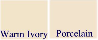 Ich hab die Farbkästchen von Porcelain und Warm Ivory mal eben nebeneinander kopiert. Da scheinen beide ungefähr die gleiche Helligkeitsstufe zu haben, aber Porcelain wirkt etwas rosig und Warm Ivory dagegen gelblich: