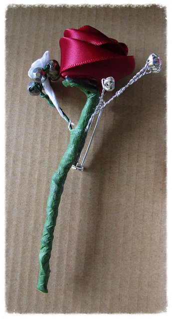 Hier noch eine Seitenansicht vom Brautstrauss und eine der Blumen zum Anstecken fuer die Familienmitglieder.